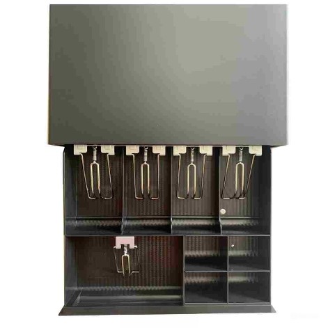 Két đựng tiền JJ335 là dòng có thiết kế nhỏ gọn phù hợp với quầy thu ngân nhỏ. Sản phẩm có 4 ngăn tiền giấy và 4 ngăn tiền xu tháo rời được. Sản phẩm được thiết kế với phía trước bo tròn nhẹ. Mặt trước của két có một khe đa năng. Thông qua khe này, bạn có thể bỏ nhanh các giấy tờ cần thiết vào bên trong két. Ổ khóa của két là loại ổ 3 cấp, bao gồm: khóa két, mở và kích mở ngăn.